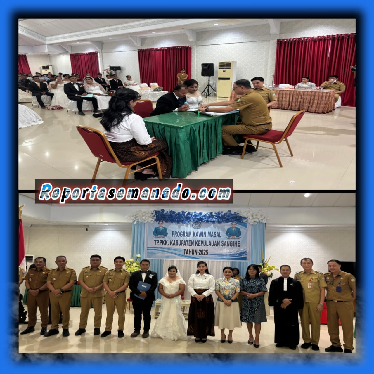 Sangihe-Reportasemanado.com — Sebanyak 13 pasangan pengantin dari wilayah Tahuna dan sekitarnya resmi mengikat janji suci dalam prosesi kawin massal yang digelar oleh Tim Penggerak PKK Kabupaten Kepulauan Sangihe, bekerja sama dengan Dinas Kependudukan dan Pencatatan Sipil (Dukcapil), Selasa (4/11/2025).