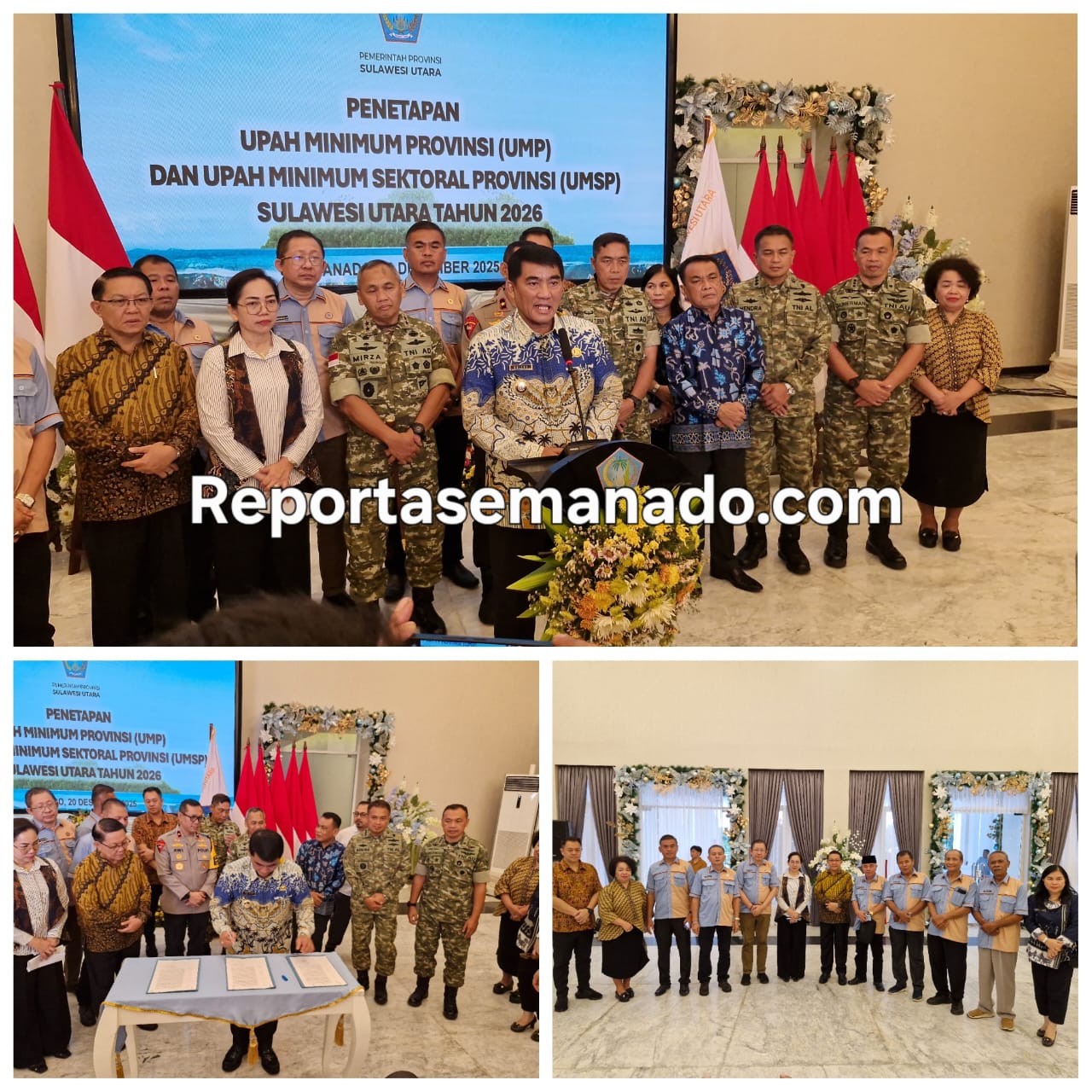 “Maka pada hari ini, Sabtu tanggal 20 Desember 2025, saya Gubernur Sulawesi Utara berdasarkan Keputusan Gubernur Nomor 404 Tahun 2025 Tanggal 20 Desember 2025 tentang Upah Minimum Provinsi Dan Upah Minimum Sektoral Provinsi Sulawesi Utara Tahun 2026, menetapkan bahwa Upah Minimum Provinsi Sulawesi Utara Tahun 2026 sebesar Rp 4.002.630,- (empat juta dua ribu enam ratus tiga puluh rupiah), menggunakan Alpha 0,8 dengan Pengali 6,018 %, kenaikan Rp 227.205 (dua ratus dua puluh tujuh ribu dua ratus lima rupiah) dari UMP sebelumnya Tahun 2025 yakni Rp 3.775.425,- (tiga juta tujuh ratus tujuh puluh lima ribu empat ratus dua puluh lima rupiah),”ujar Gubernur YSK
